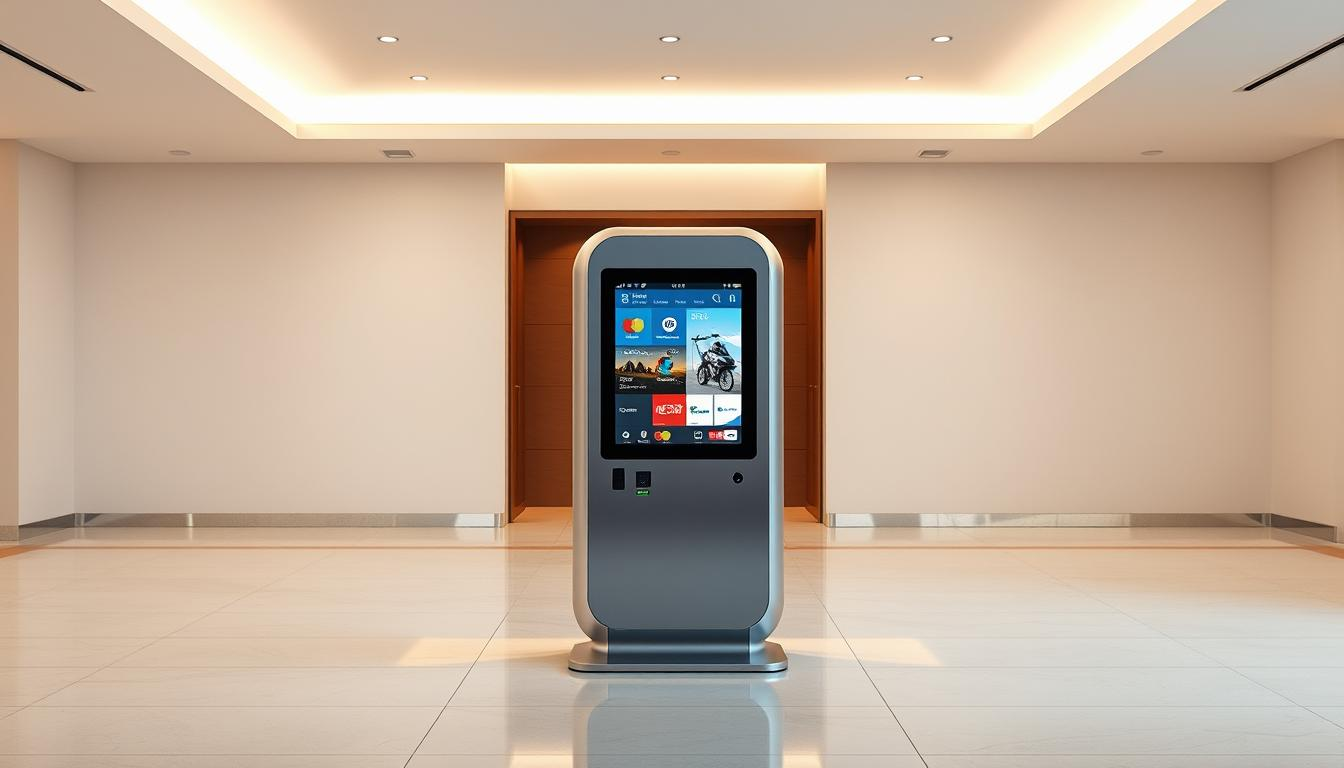 A self-service kiosk is an interactive touchscreen device. It lets customers order, pay, and explore products on their own. This makes transactions faster and cuts down on staff needs.